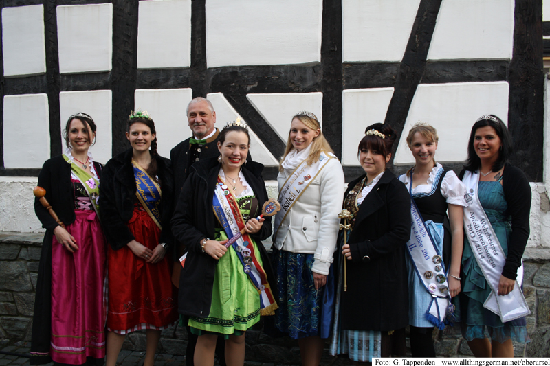 v.l.n.r.: Susanne aus Bergen-Enkheim (Apfelweinkönigin), Beatrice I. aus Sachsenhausen (Brunnenkönigin), Brunnenmeister Kurt, Brunnenkönigin Annabel I., Isabell I. aus Bruchköbel (Zuckermaiskönigin), Melissa I. aus Goldstein (Rosenkönigin), Katharina II. aus Rosbach (Blütenkönigin), Sandra I. aus Wehrheim (Apfelblütenkönigin)