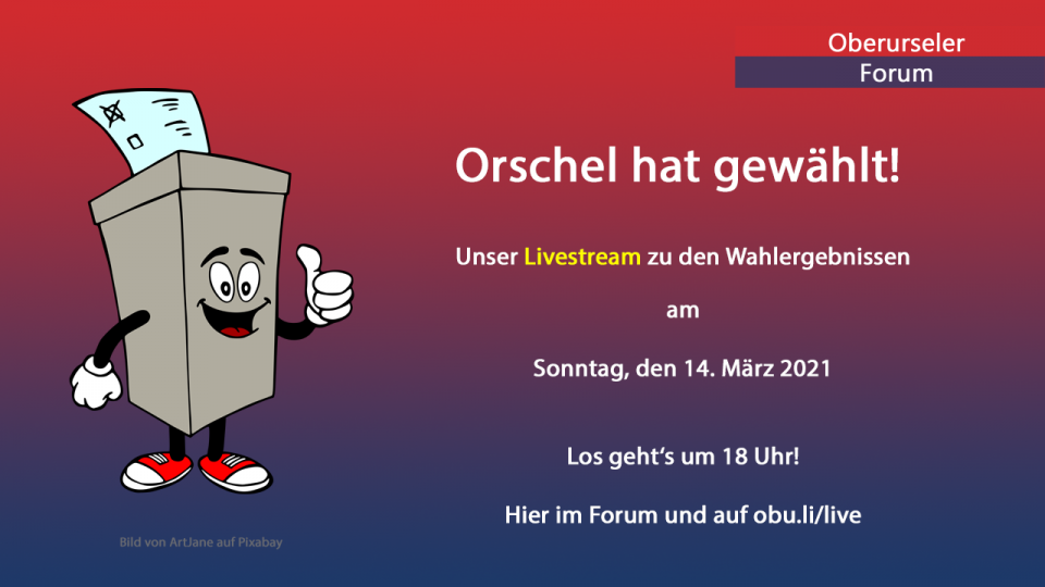 Nachdem die Wahlämter am Sonntag Abend geschlossen haben, werden wir Live im Oberursel Forum auf Facebook (obu.li/forum) und auf YouTube (obu.li/live) sowie Periscope (pscp.tv/orschel2day) sein um die Ergebnisse zu diskutieren und mit den Kandidat*innen zu sprechen.