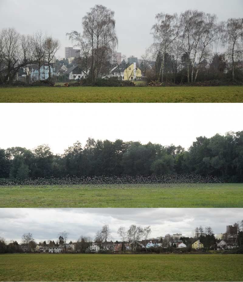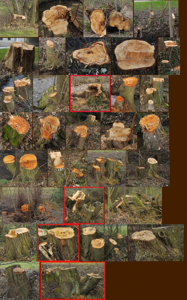Nachstehend ein Sammelsurium der diesjährigen Stümpfe, sowie ein Vergleichsbild von 2010 (mit dem Vogelschwarm) und dem jetzigen Zustand. Etwas unfair zwar, weil die Bäume im Vergleichsbild nicht kahl sind, doch sind die geschlagenen Lücken unverkennbar.