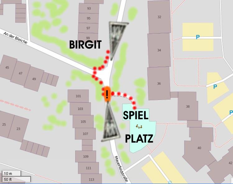 Unsere Kinder haben gelernt, die Stellen zu suchen und zu finden, die durch “Parkverbote”, weil es dort eine Einfahrt zu Garagen gibt, zu nutzen. Sie haben auch gelernt, sich soweit vor zu wagen, dass sie herankommende Autos wirklich sehen können und somit von aufmerksamen Autofahrern auch gesehen werden können. Die eine Stelle ist bei uns direkt vor der Haustür, die andere Stelle befindet sich ” an der Bleiche” bei der 2. Garageneinfahrt – dort haben die Kinder die Möglichkeit auch auf der Gegenseite nicht über Blumenkübel o.ä. steigen zu müssen, um auf den Gehweg zu gelangen. Der wirkliche Gefahrenpunkt war der direkt vor der GS, da es immer -trotz Polizeieinsätze- Eltern gibt, die den Schulweg dort, der seeeehr eng ist, als Rennstrecke benutzen oder ihre Kinder bis zum Tor fahren