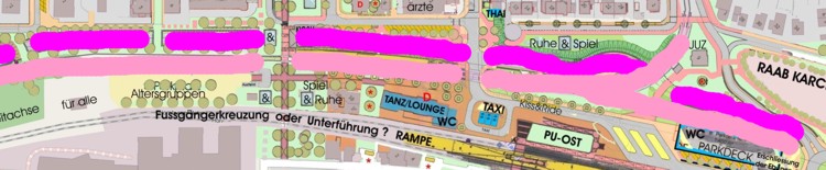 o Es gibt keine zusätzliche Zerschneidung durch den Trog [violett], da dieser immer nur an den Stellen verläuft, wo die ebenfalls als (flacher) Trog ausgebildete U-Bahn-Trasse[rosa] bereits die Stadtlandschaft zerschneidet: