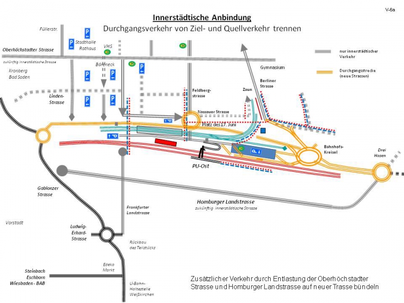 Das angestrebte Ausdünnen des Durchverkehrs durch eine neue Trasse von der Weingärtenumgehung zu den Drei Hasen zielt auf eine nachhaltige und nennenswerte Entlastung des Verkehrs in der Innenstadt. Dies steigert die Aufenthaltsqualität rund um den Alleenpark mit dem neuen Adenauer Zentrum und die Attraktivität des Einzelhandelsstandorts Oberursel und auch der südlichen Vorstadt mit dem Verkehrsknoten – dem am stärksten frequentierten Bereich der Stadt. Es bietet sich an, die eingesparten 300.000 € in den Ausbau von Parkplätzen für die Käufer Rund um das Adenauer Zentrum zu investieren!